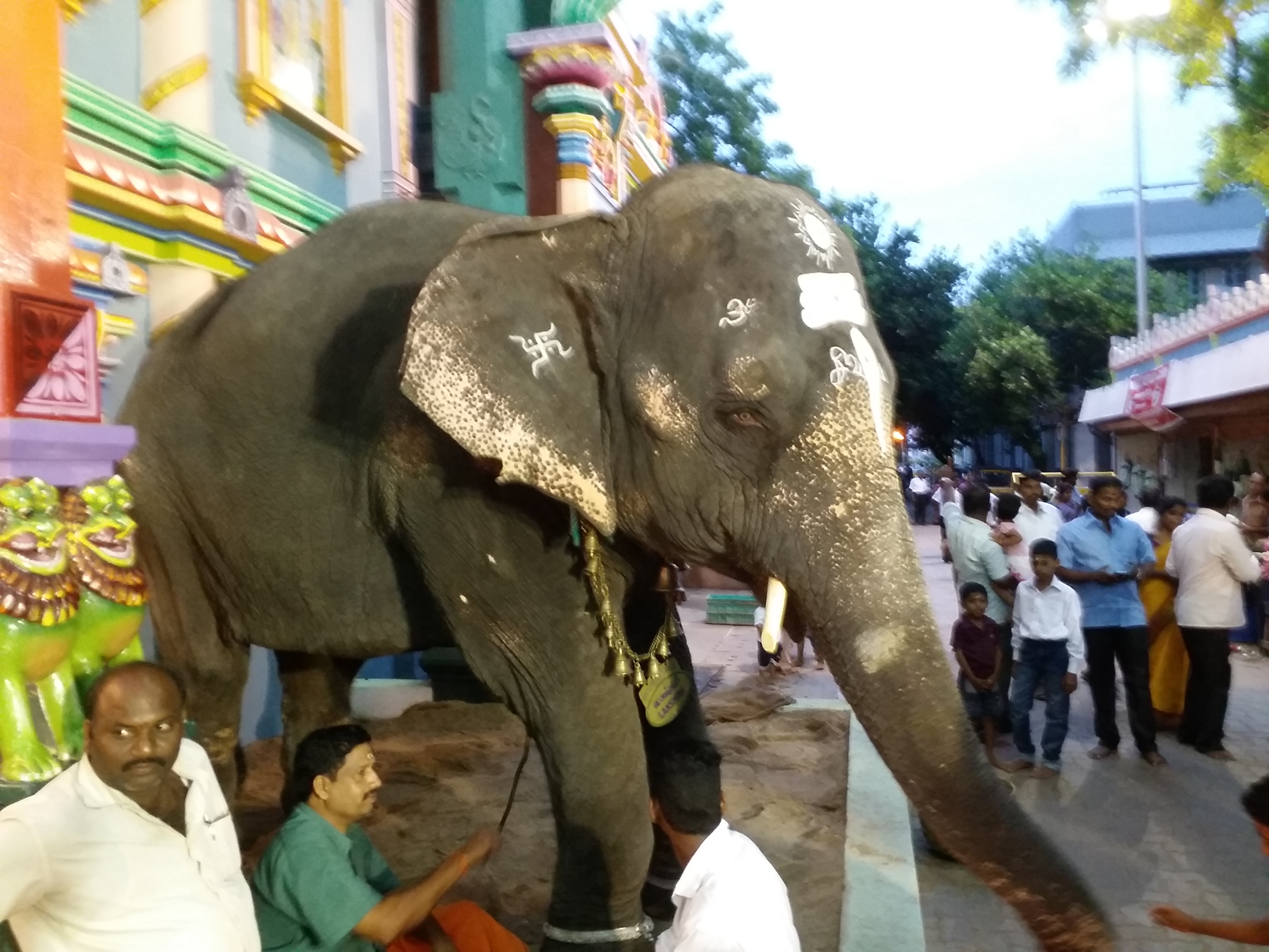 The on to a huge bustling temple to Ganesh, the Elephant god; where this poor chap stood outside, prodded by a miniscule handler to take the money from the hands of supplicants and give them a gentle knock to the head.