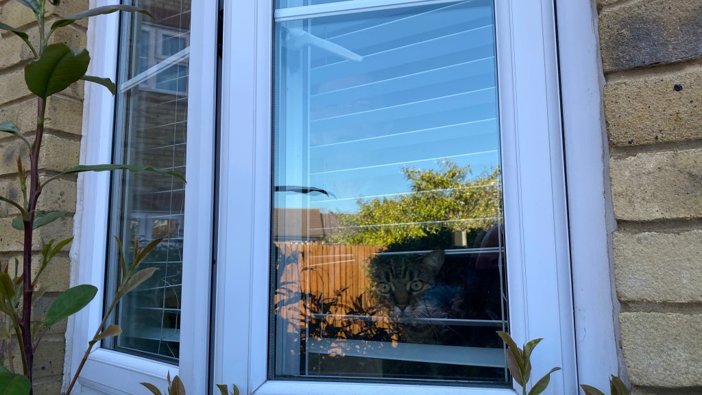 ‘There’s no cat here. Idiot. My dad has a cat that never manages to get out of the flat either, although i suspect she’d like to, I can’t imagine that it’s much fun being locked up with him 24×7.’