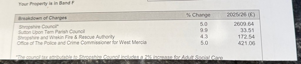 This is my council tax bill, I’m responsible for the 9.9% increase part. It’s fuck all, but we’ll spend it on things that people actually tell us they want rather than hoping Shropshire will sort everything (they won’t).