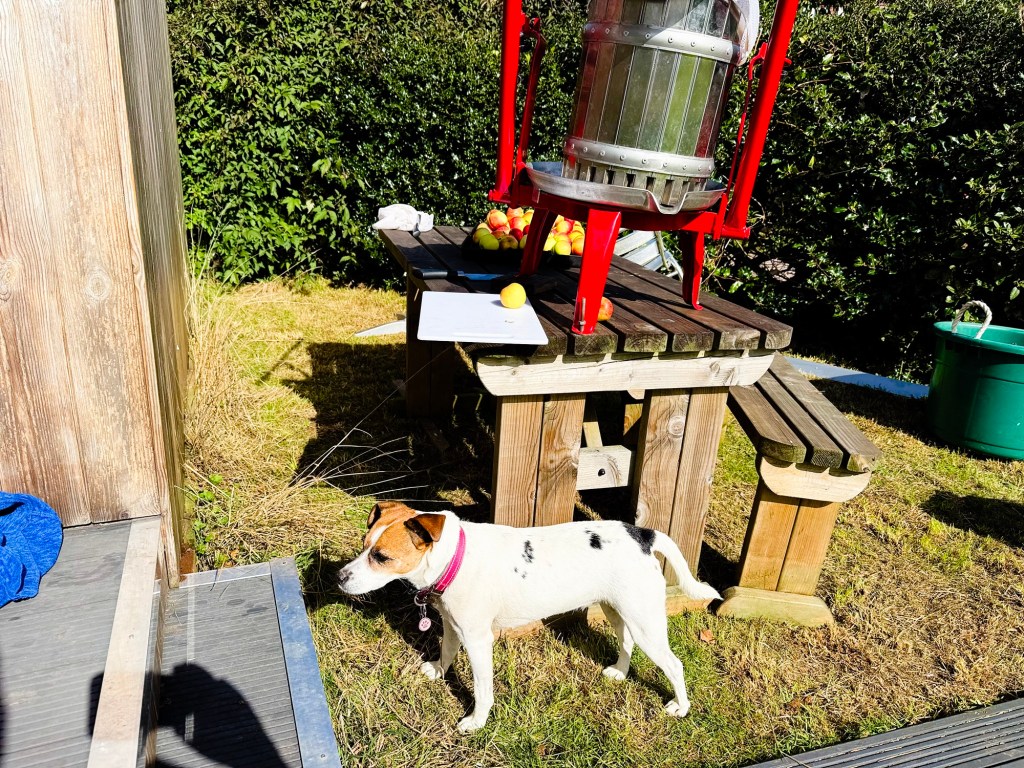 The dogs have been there for the whole thing, Cairo is quite the apple thief and we’ve had to stop a number of times so that she can chase them as they’re thrown for her – Milo patrols the grounds or sleeps in my office as I do the physical, repetitive work of cutting the apples, macerating and then pressing the juice.